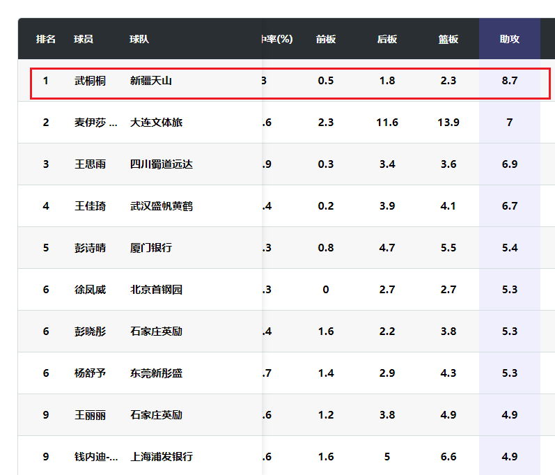 武桐桐本赛季场均得到18.2分2.3篮板8.7助攻1.6抢断。她的投篮命中率为45.8%,三分命中率37.9%,罚球命中率83%。武桐桐在联赛助攻榜排名第一,此外她在本土得分榜高居第一。再加上她率领上赛季排名联赛倒数的新疆女篮成为季后赛级别的球队,武桐桐毫无疑问是本赛季表现最出色的本土球员。