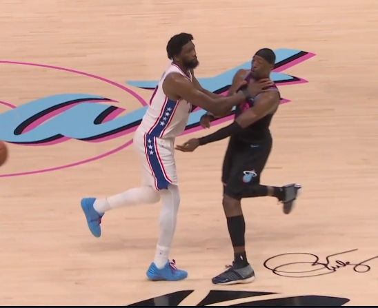 末节最后时刻,恩比德不慎掐到阿德巴约喉咙。裁判吹罚为普通犯规。